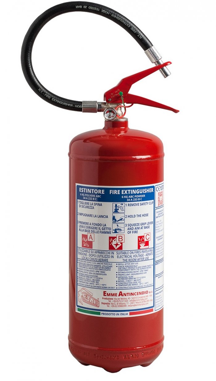 Fire extinguisher 6 kgs ABC dry powder, stored pressure type. MED/BV approved. Make: EMME Antincendio SRL – Italy